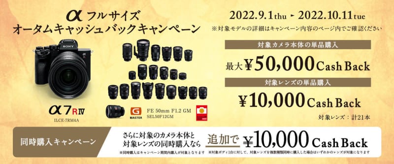 ソニーは、ミラーレスカメラ「α」や交換レンズの購入で最大50,000円をキャッシュバックする「αフル…