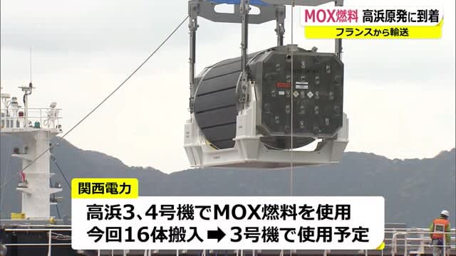 Published by 福井テレビ フランスで製造されたプルトニウムとウランを混ぜたMOX燃料を積んだ輸送船が22日、高浜原発に到着し搬…