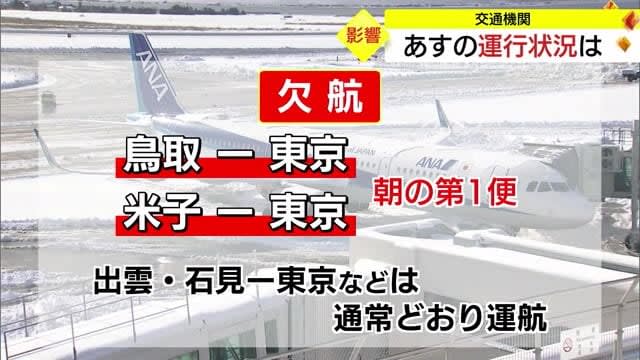 Published by 山陰中央テレビ 交通機関の26日の運行状況です。まず、空の便は、ANAの鳥取・米子両空港から東京に向かう朝の第1便の…