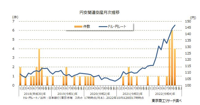 Published by TSR速報 10月の「円安」関連倒産は、4件(前年同月ゼロ件)発生した。2022年1-10月累計は17件に達し、…