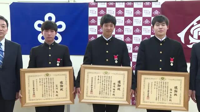 踏切の中で転び、動けなくなっていた高齢の男性を助けたお手柄高校生3人に紅綬褒章が贈られました。 紅綬…