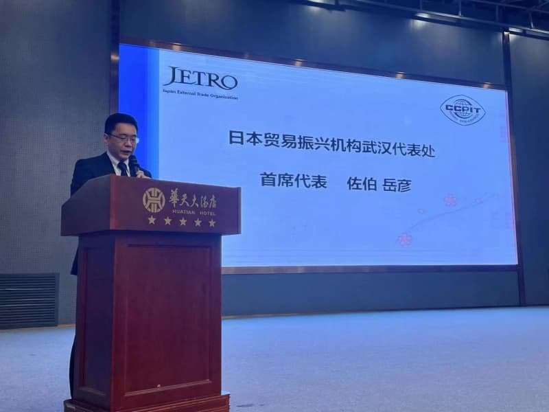 Published by 新華社通信 2月28日、壇上であいさつする日本貿易振興機構(ジェトロ)武漢事務所の佐伯岳彦所長。(長沙=新華社配…