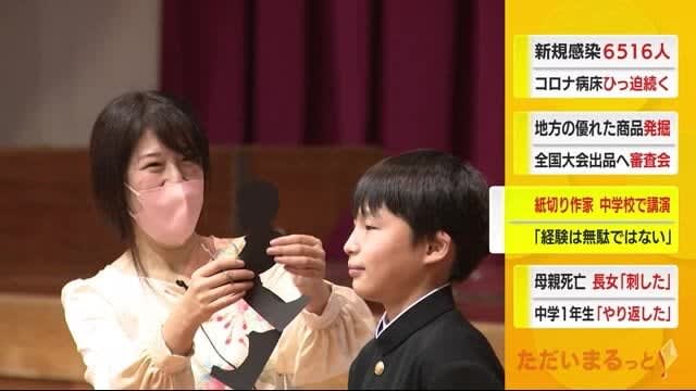 紙切り作家が静岡県御前崎市の中学校で講演です。 講演したのは、ハサミひとつで下書きをせずに1枚の紙か…