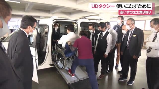 タクシー乗務員が、車いすで乗り降りできるユニバーサルデザインタクシーの使い方を学ぶ研修が19日那覇市…