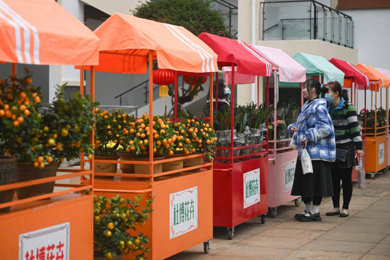 18日、海南熱帯花卉取引(競売)市場で鉢花を選ぶ市民。(海口=新華社記者/蒲暁旭) 【新華社海口1月…