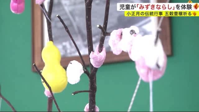 小正月の伝統行事の話題です。紅白の餅を木の枝に飾りつけ五穀豊穣を祈る「みずきならし」が、2月1日に岩…