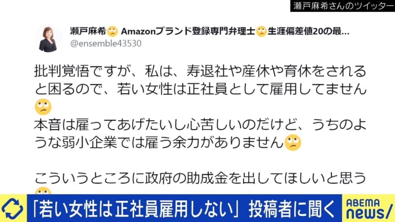 「寿退社や産休や育休をされると困るので、若い女性は正社員として雇用してません」 「大企業なら1人辞め…