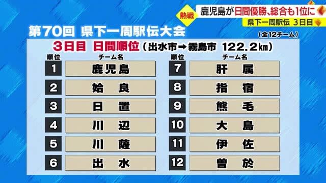 県下一周駅伝、3日目の20日は、鹿児島県・出水市役所野田支所から霧島市日当山までの11区間、122.…