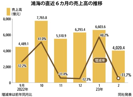 EMS(電子機器の受託製造サービス)世界最大手、鴻海精密工業が5日発表した2023年2月の連結売上高…