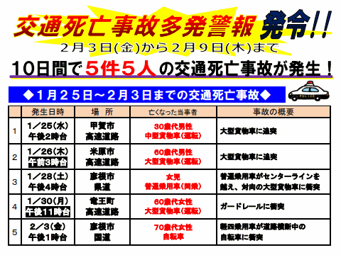 Published by TraffiClip 滋賀県内で1月25日からの10日間に5件5人の交通死亡事故が発生したことから、滋賀県交通対策協議会は…