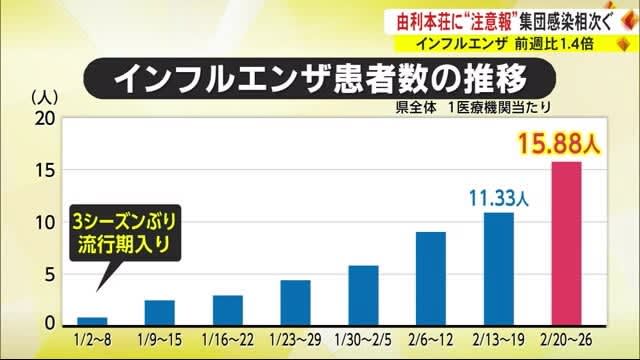 Published by 秋田テレビ 秋田県全体のインフルエンザ患者数は、前の週より1.4倍に増え、新たに由利本荘保健所管内に注意報が発表…