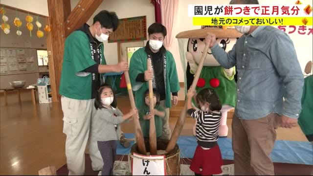 Published by 秋田テレビ 新年を迎えるまで1カ月を切り、秋田県湯沢市のこども園では、園児が昔ながらの臼ときねを使った餅つきを体…