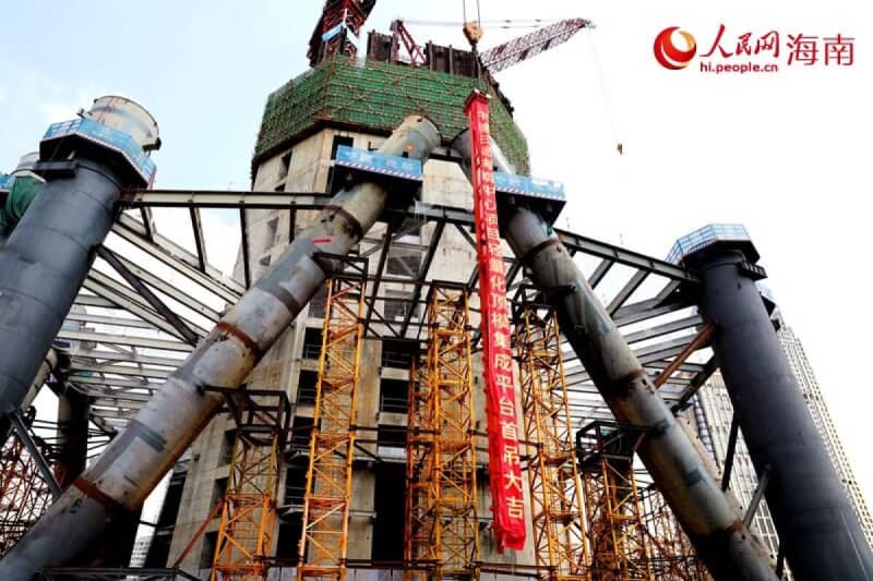 Published by Record China 海南省で建設中の同省一高いビルとなる「海南センター」の建設プロジェクトにおいて、「空中ビル建設装置」…