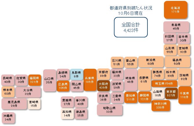 Published by TSR速報 10月6日は16時時点で「新型コロナ」関連の経営破たん(負債1,000万円以上)が6件判明、全国で累…