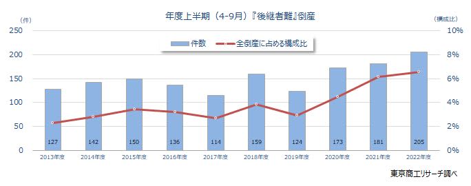 Published by TSR速報 2022年度上半期(4-9月)の後継者不在による『後継者難』倒産(負債1,000万円以上)は、205…