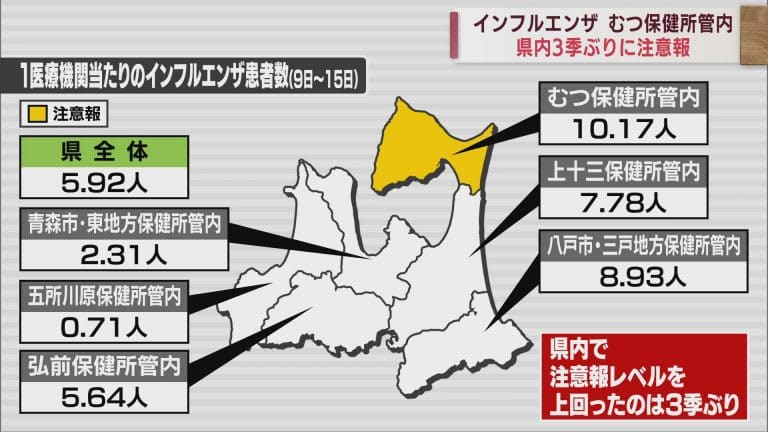 Published by ABA青森朝日放送 インフルエンザの発生状況についてです。むつ保健所管内では、3シーズンぶりに注意報レベルを上回りました…