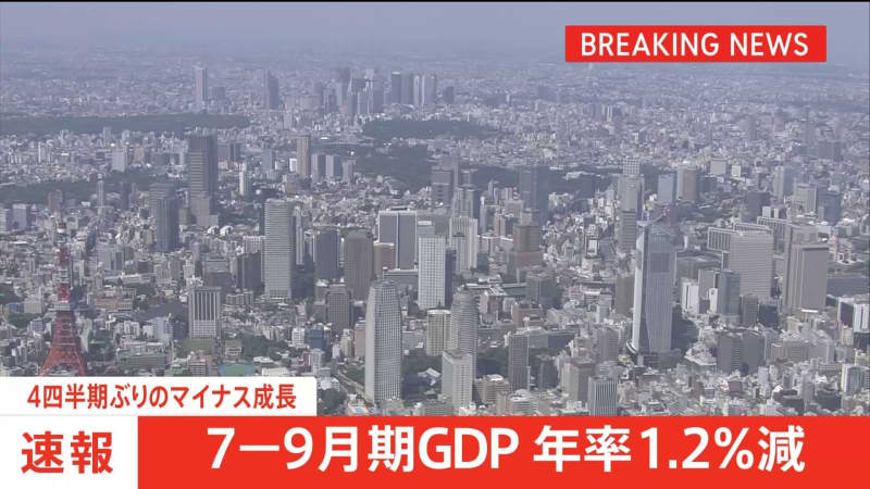 Published by TBS NEWS DIG 今年7月から9月までのGDP=国内総生産は、年率換算で1.2%の減少となりました。4四半期ぶりのマイ…