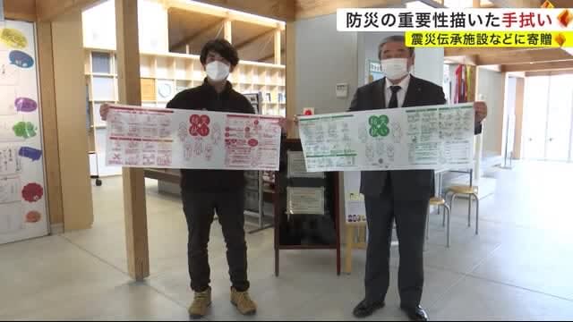 Published by 岩手めんこいテレビ 東日本大震災の発生から12年を前に、岩手県釜石市と宮古市の津波伝承施設に防災について描かれた手拭いが…
