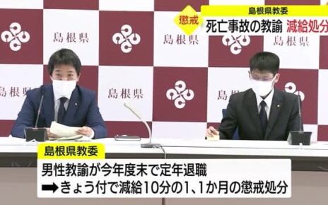 Published by 山陰中央テレビ 死亡事故を起こした小学校教諭を懲戒処分です。 処分を受けたのは、大田市の小学校に勤務する60歳の男性…
