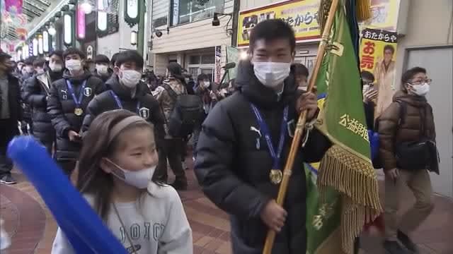 Published by 岡山放送 歓喜の渦ができました。高校サッカーで初の日本一に輝いた岡山学芸館高校の凱旋パレードが岡山市中心部で行…