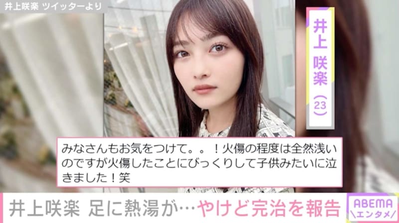 Published by ABEMA TIMES タレントの井上咲楽(23)が26日、自身のInstagramを更新し、足に負ったやけどが治ったことを…