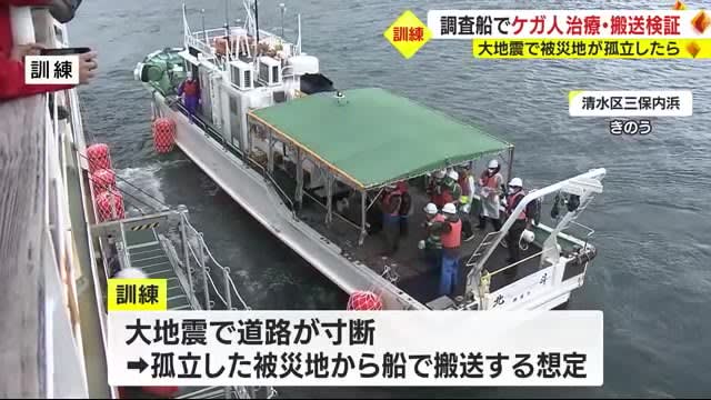 Published by テレビ静岡 大地震で被災地が孤立したことを想定し、大学の海洋調査船を使った訓練が静岡市清水区でおこなわれ、ケガ人…