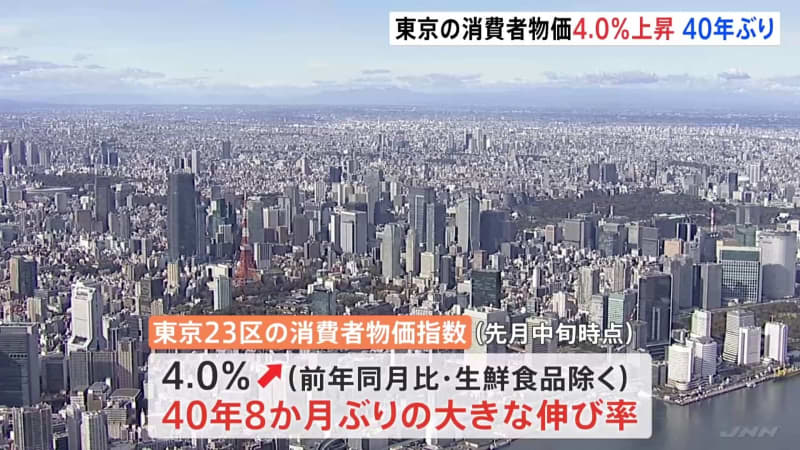 Published by TBS NEWS DIG 東京23区の消費者物価指数は、先月中旬時点での速報値で4.0%上昇しました。4%台になるのは40年8…