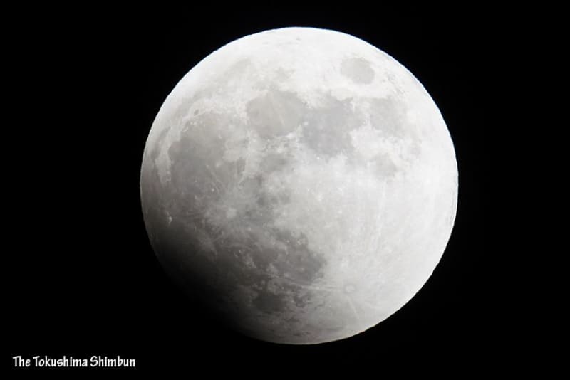 Published by 徳島新聞 8日午後7時16分、地球の影で月が全て隠れる皆既月食が始まった。徳島市中徳島町2の徳島新聞本社屋上で…