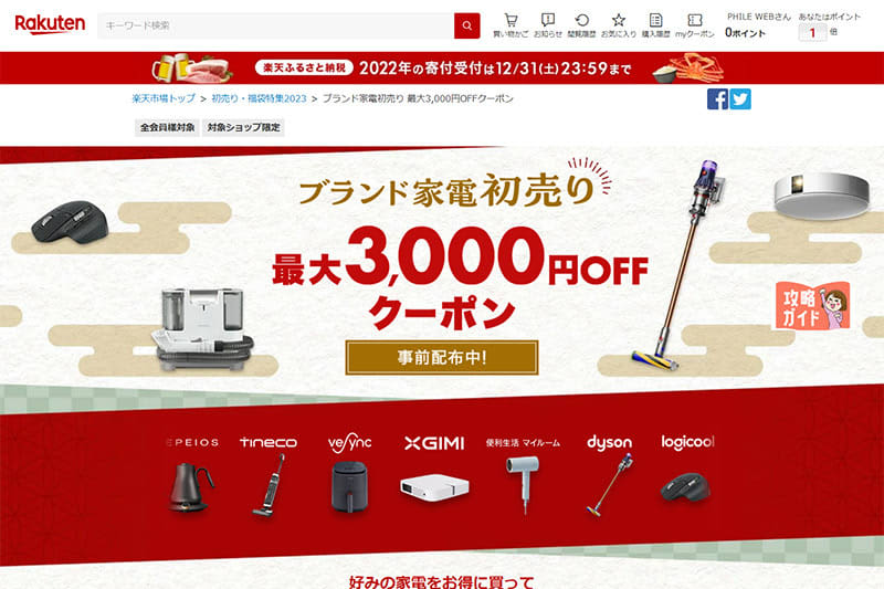 Published by PHILE WEB 楽天市場は、「ブランド家電初売り」セールを2023年1月1日 0時〜1月16日 9時59分の期間で実…