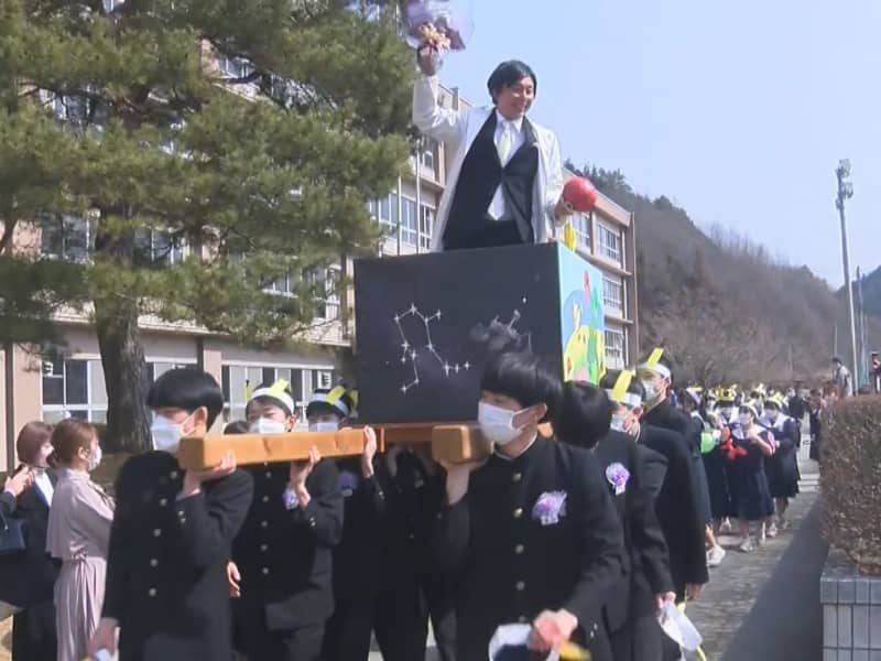 Published by 東海テレビ 岐阜県高山市の東山中学校で8日、卒業式があり、卒業生が担任の教師らを担いで歩く恒例の「卒業みこし」も…